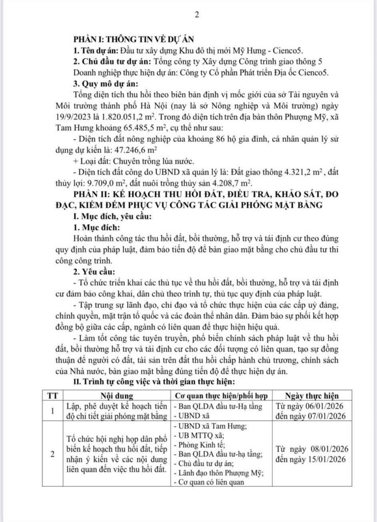 Khu đô thị Mỹ Hưng Cienco 5 nằm trên địa bàn thôn Phượng Mỹ – Xã Tam Hưng là một trong những dự án quy mô lớn tại phía Nam Hà Nội. Do chủ đầu tư CÔNG TY CỔ PHẦN PHÁT TRIỂN ĐỊA ỐC CIENCO 5 thực hiện dự án. Bước sang năm 2026, dự án chính thức bước vào giai đoạn triển khai quan trọng với lộ trình thu hồi đất, giải phóng mặt bằng và hoàn thiện các thủ tục pháp lý theo quy định của pháp luật.