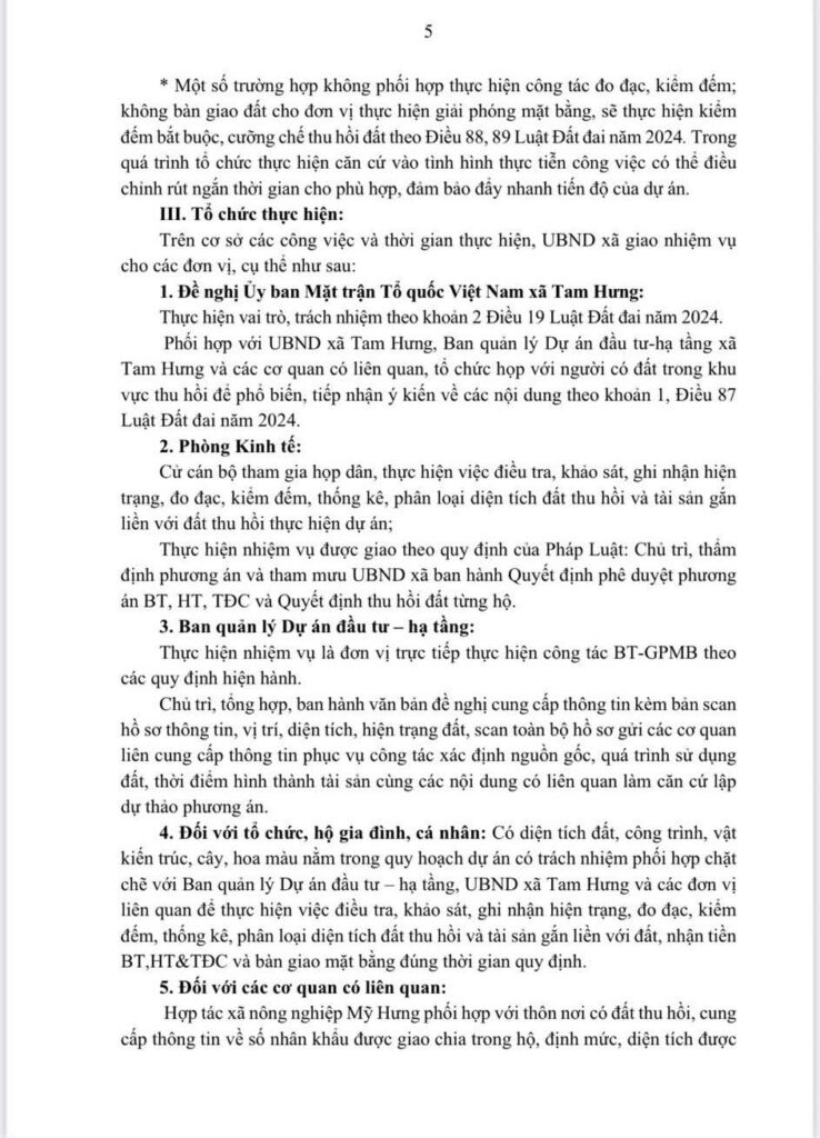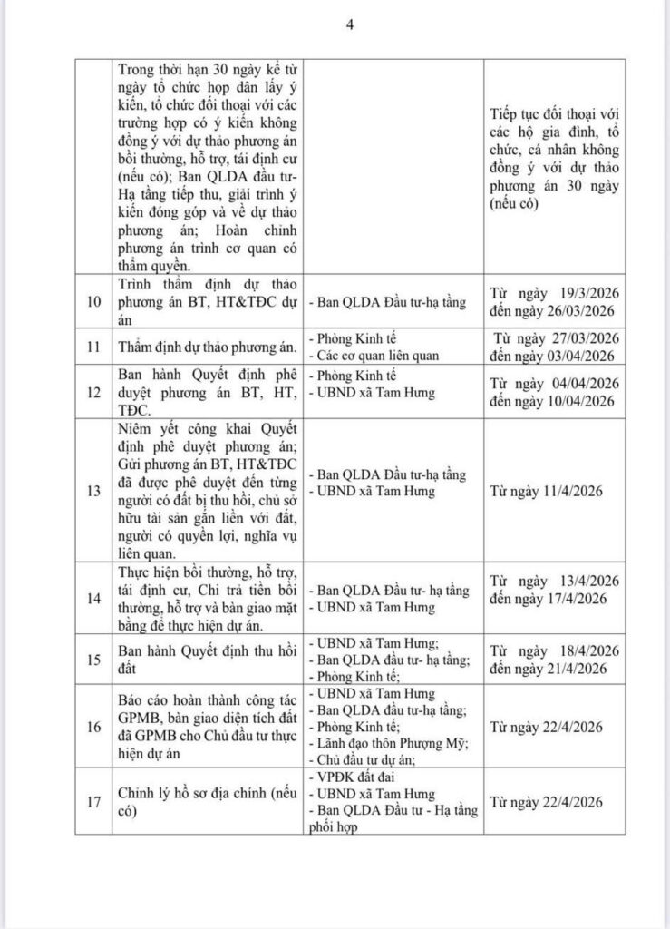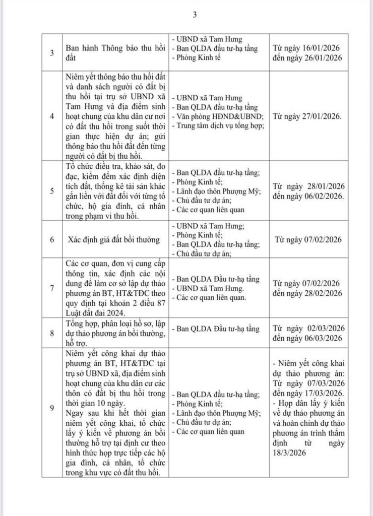 Trong văn bản cũng nêu ra chi tiết các mốc thời gian cho thấy quá trình thực hiện dự án được chuẩn bị bài bản, minh bạch và có lộ trình rõ ràng. Thể hiện sự chủ động của chính quyền địa phương trong công tác thu hồi đất, giải phóng mặt bằng, đồng thời tạo cơ sở để người dân theo dõi, giám sát và đảm bảo dự án được triển khai đúng tiến độ, đúng quy định của pháp luật.
