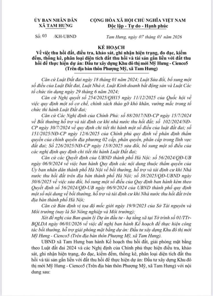 Dưới đây là văn bản Kế hoạch về việc thu hồi đất, điều tra, khảo sát, ghi nhận hiện trạng, đo đạc, kiểm đếm, thống kê và phân loại diện tích đất thu hồi cùng tài sản gắn liền với đất để thực hiện dự án Đầu tư xây dựng Khu đô thị Mỹ Hưng – Cienco 5, do Ủy ban nhân dân xã Tam Hưng ban hành ngày 07/01/2026.