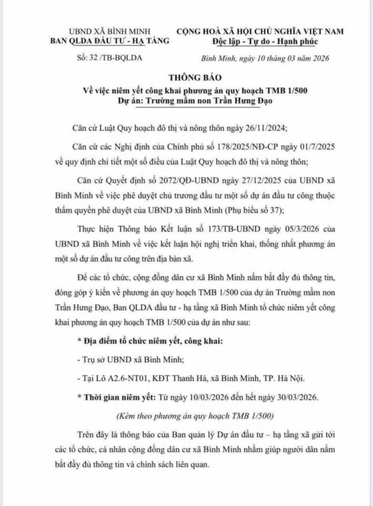 Theo thông báo ngày 10/03/2026 từ Ban Quản lý Dự án Đầu tư – Hạ tầng xã Bình Minh, việc niêm yết công khai phương án quy hoạch nhằm giúp các tổ chức, cá nhân và cộng đồng dân cư nắm bắt đầy đủ thông tin liên quan đến dự án, cũng như tạo điều kiện để người dân đóng góp ý kiến trước khi dự án được triển khai chính thức.