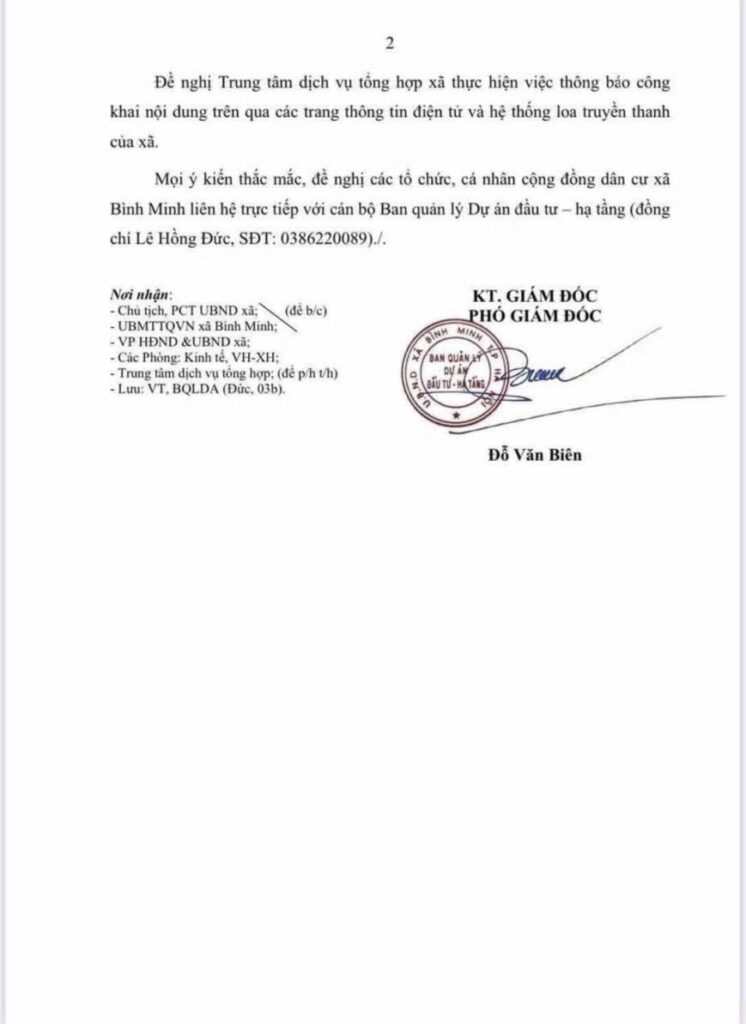 Trong thời gian niêm yết, các tổ chức, cá nhân và cộng đồng dân cư có thể theo dõi thông tin quy hoạch và gửi ý kiến đóng góp tới Ban Quản lý Dự án Đầu tư – Hạ tầng xã Bình Minh để được giải đáp và tiếp nhận ý kiến.