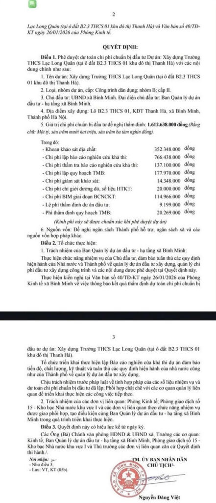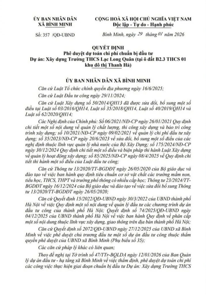 Trường THCS Lạc Long Quân là dự án hạ tầng giáo dục nhận được sự quan tâm đặc biệt của cư dân tại khu đô thị Thanh Hà. Theo thông tin mới nhất ngày 29/01/2026, UBND xã Bình Minh đã ban hành Quyết định số 357/QĐ-UBND phê duyệt dự toán chi phí chuẩn bị đầu tư Dự án Xây dựng Trường THCS Lạc Long Quân tại Khu đô thị Thanh Hà, với tổng kinh phí hơn 1,6 tỷ đồng, bao gồm các hạng mục khảo sát địa chất, lập báo cáo nghiên cứu khả thi, lập quy hoạch tổng mặt bằng, thẩm định hồ sơ và các chi phí kỹ thuật liên quan.